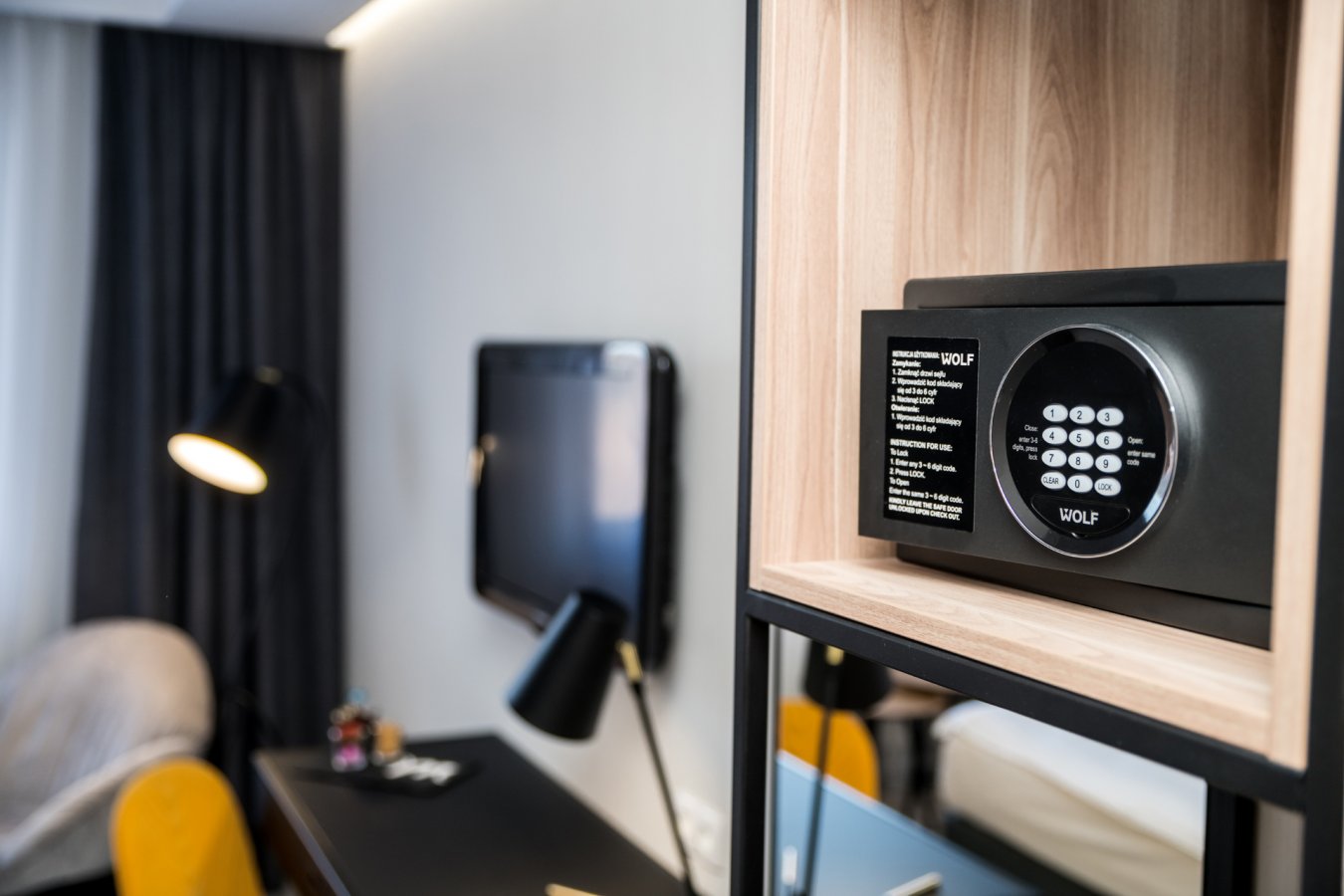 e cassetta di sicurezza individuale. (Queste sono stanze bianche e grigie con vista di case